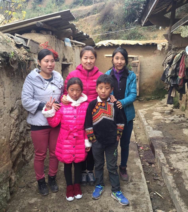 (谢云霞(中)和支教老师去家访时和学生合影)