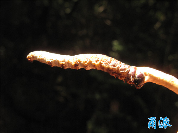仔细观察后,我发现上部的草(学名叫菌物的子座)表面光滑呈白色,顶端膨大,草部全长约6cm;下部虫体呈棕褐色,长约4cm,虫体环纹明显,3对胸足十分显著,并可见有4对腹足,虫体背面有许多圆形的小斑点,但虫体外表面覆有一层薄薄的白色菌膜,虫体的头部呈红棕色并显著外露,草部是直接从虫体的头顶长出,草与虫体呈一条直线。我将其从土中拔出时没有遇到任何阻力,表明虫体当时就是在土中呈垂直状态生长。这与出产于青藏高原的正宗的冬虫夏草菌有较大的区别。