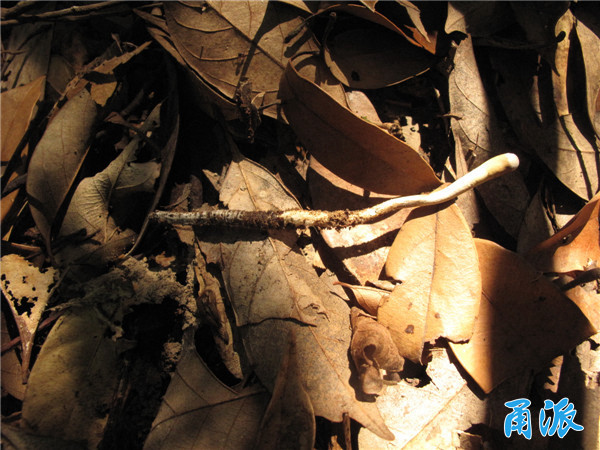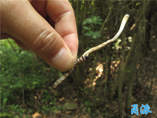 端午节那天,我去位于鄞州区的象山港海边的某山上考察植物资源。在一片常绿阔叶林中,地上满是枯枝落叶,光线阴暗寸草不生,我突然看到有个小白点从枯叶缝中探出头来,直径只有不到5mm的大小。根据长期在野外考察的经验,我可以肯定这一定是个菌物,但是又是我从未见过的物种,心想不会是虫草菌吧?于是顺手将其拔出来看,结果真的是一种虫草菌,因为其下部就有一条蛾子幼虫与上部的菌物子座相连着。