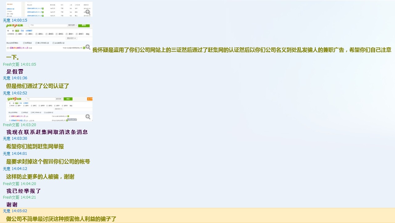 今天接到网友举报,有不法分子冒用我公司名义在赶集网等媒体发布假冒网络兼职招聘,本公司在此声明此消息为假冒消息,请广大网友注意不要上当,以免造成经济等方面的损失,以下为网友举报聊天记录截图.