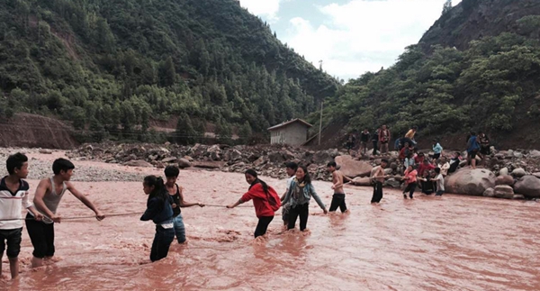 大凉山的雨季漫长而磨人,由于山体土质的问题,雨季出现山体滑坡是司空见惯的。有一段时间,下山唯一的通道——吊桥被山洪冲垮,送孩子们上下学成了老师们每天的必修课。老师运送物资或者一些学生上学放学都要蹚着齐腰深的水过河。