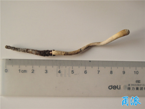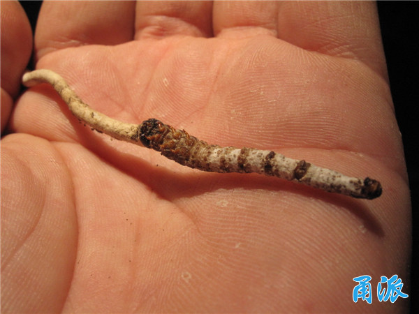 仔细观察后,我发现上部的草(学名叫菌物的子座)表面光滑呈白色,顶端膨大,草部全长约6cm;下部虫体呈棕褐色,长约4cm,虫体环纹明显,3对胸足十分显著,并可见有4对腹足,虫体背面有许多圆形的小斑点,但虫体外表面覆有一层薄薄的白色菌膜,虫体的头部呈红棕色并显著外露,草部是直接从虫体的头顶长出,草与虫体呈一条直线。我将其从土中拔出时没有遇到任何阻力,表明虫体当时就是在土中呈垂直状态生长。这与出产于青藏高原的正宗的冬虫夏草菌有较大的区别。